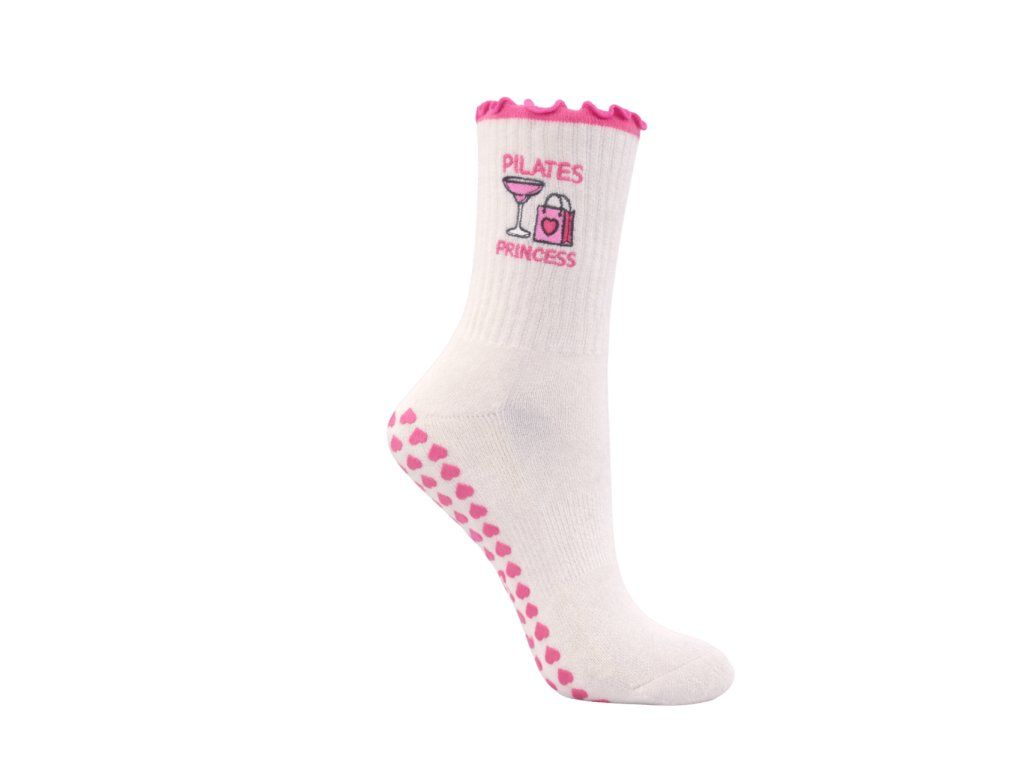 Objevte naše královské ponožky LUNARI Pilates Princess v krémové barvě s růžovým volánkovým lemem a vyšívaným nápisem. Protože každá žena, která cvičí pilates, je princezna.