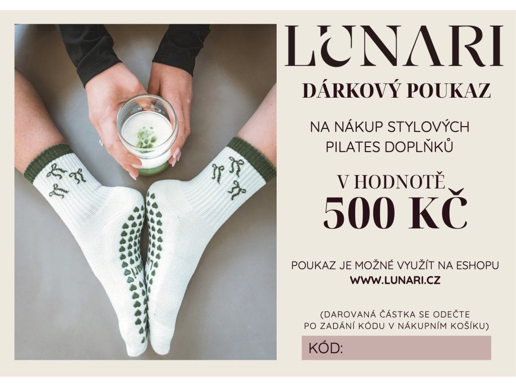 Voucher lze uplatnit na nákup protiskluzových ponožek Lunari – prémiových ponožek navržených speciálně pro pilates, které spojují funkčnost s moderním designem.